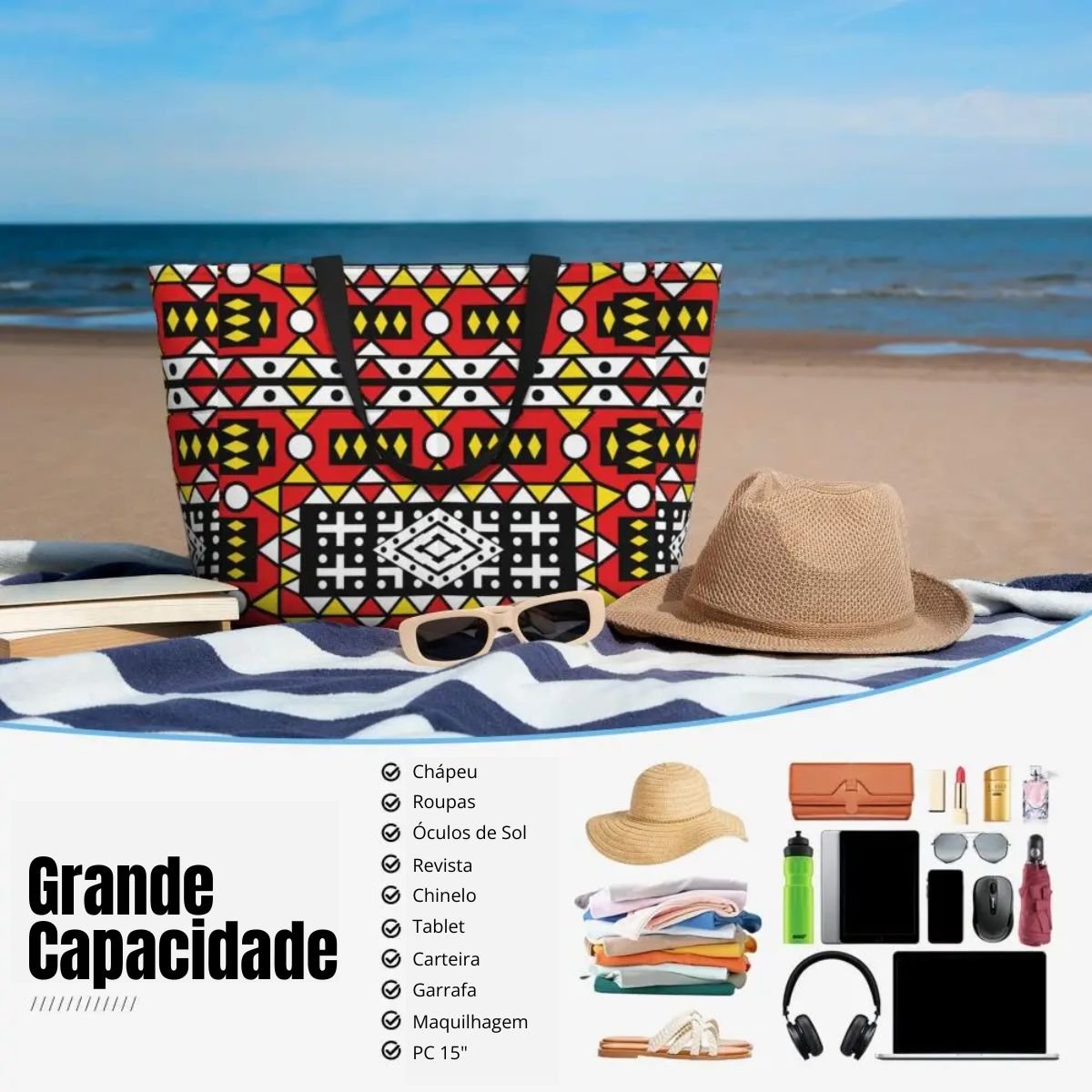 Ideal para o mercado, praia, ginásio ou viagens, oferece grande capacidade e resistência, sem perder o charme. Produzida com tecido africano, alia autenticidade, durabilidade e versatilidade num só acessório.